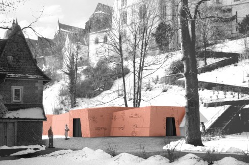 Steinerne Skulptur zum Aufbewahren und Lagern | Die Albrechtsburg Meißen benötigt für einen Teil Ihrer historischen Museumsstücke ein neues Depotgebäude sowie einen Lagerraum für die Landschaftspfleger. Das Projekt für den Neubau ging aus einem Wettbewerbserfolg 2009 hervor. Das neue Gebäude entsteht am Fuße der Festung und bildet zusammen mit dem Burgberg eine räumliche Kulisse eigener Qualität. Es fügt sich harmonisch in die stadträumliche Situation um das bestehende Gärtnerhaus ein, welches bewusst freigestellt bleibt. Damit wird in die vorhandene Struktur zum Schutz des Ortes als Bau- und Naturdenkmal nur behutsam eingegriffen. Der zweigeschossige Entwurf greift das Motiv der Burgmauern, die den Berg stützen und Kammern bergen als Leitmotiv auf und tritt als einfache steinerne, halb im Berg versenkte Skulptur zum Aufbewahren und Lagern nur mit einem überirdischen Geschoss zu Tage. Die kantige Kubatur und die strukturierte Betonfassade übertragen dabei die Anmutung und Haptik des rötlichen, den Ort bestimmenden Natursteins wie selbstverständlich in die Architektursprache der Gebäudes.